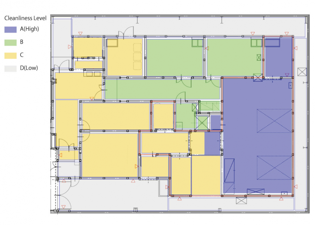 There is no air-conditioning control or secondary changing area, but because this route leads into the manufacturing area, hand washing is performed, and the passage is separated by doors from Cleanliness Class C to Cleanliness Class B.